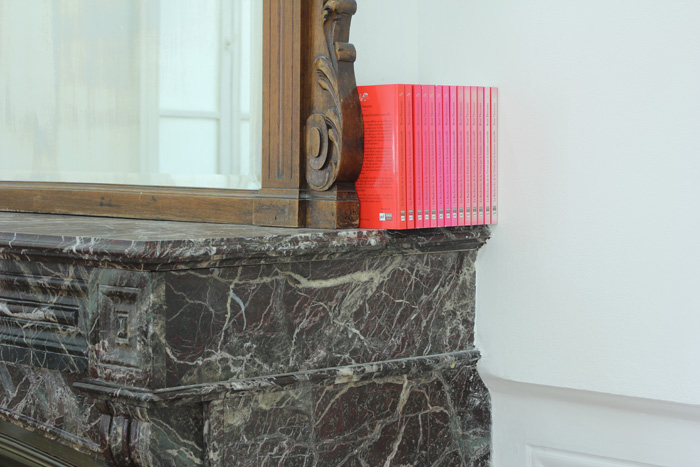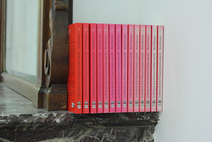 | La recherche de la vérité par la lumière naturelle est composée d’une douzaine d’exemplaires du même ouvrage éponyme de René Descartes. Les livres ont été exposés à la lumière du soleil pendant des durées progressives, allant jusqu’à 3 ans, produisant ainsi un dégradé sur les tranches. |