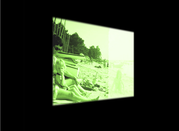 L’installation est composée d’un projecteur diapo à carousel qui tourne automatiquement. Sur les 60 vues, une seule contient une image. C’est la seule diapositive que je possède de ma mère jeune. Mon père avait pour habitude de me donner ses diapositives ratées, et je les projetais dans ma chambre.