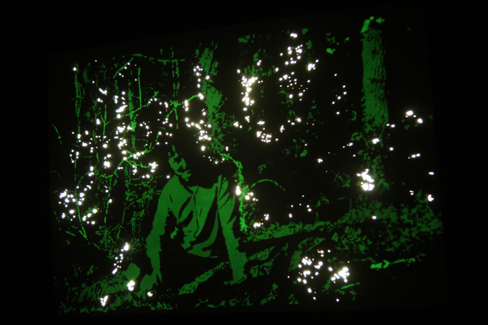 L’image est projetée sur une paroi luminescente. Elle disparaît lentement dans le noir, puis vient s’imprimer à nouveau sur la surface sensible du mur. |